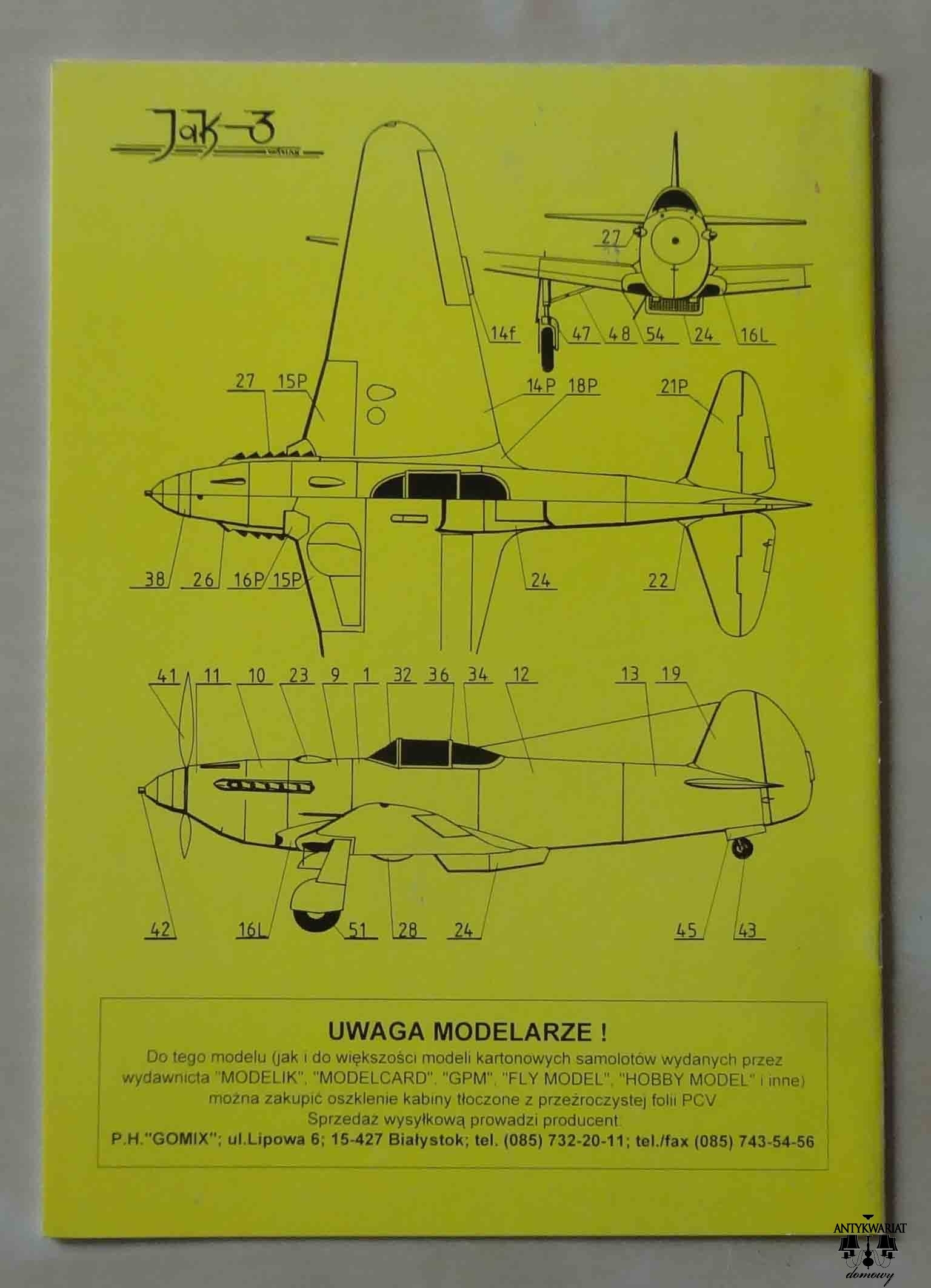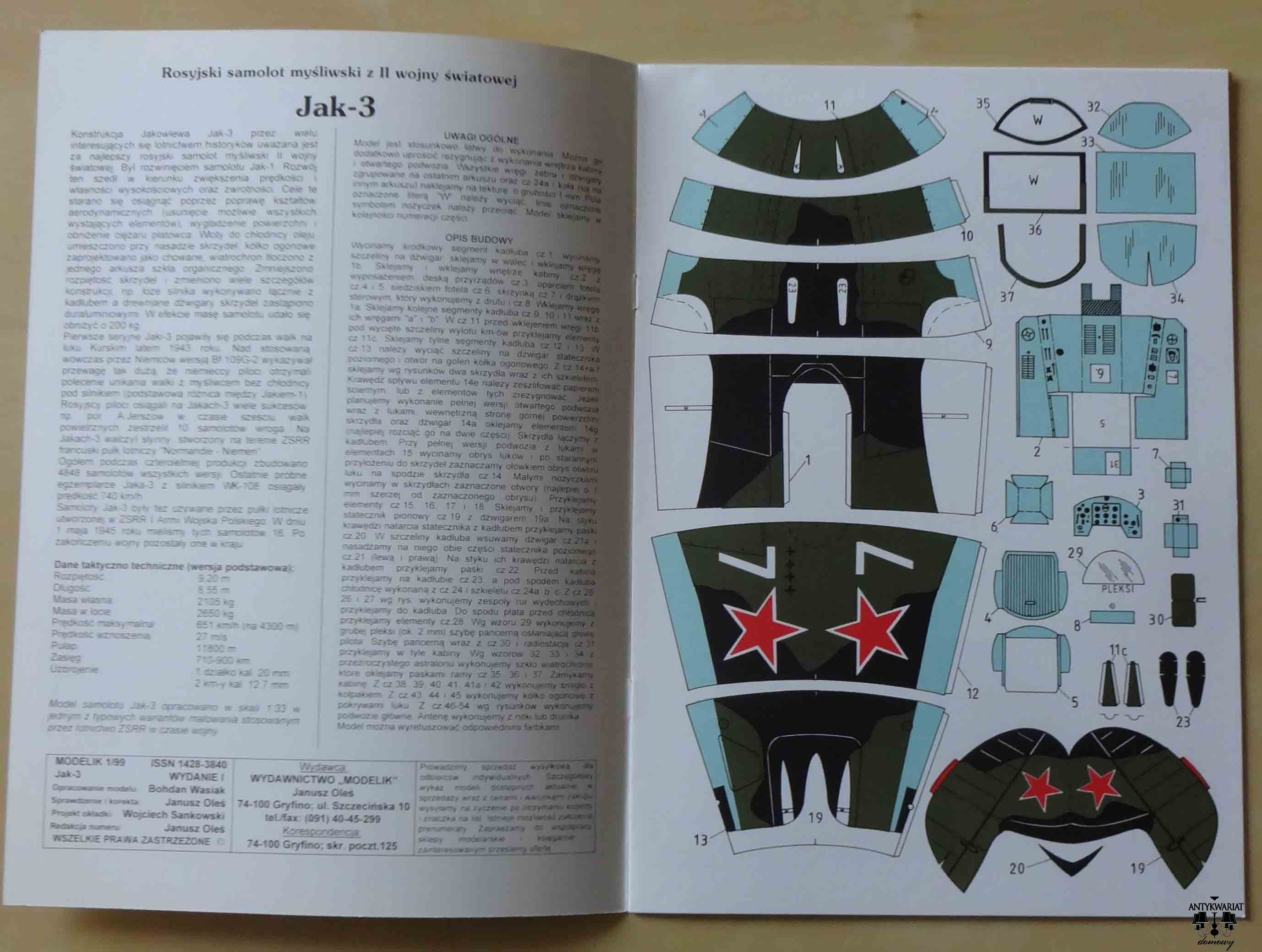 Jak-3, skala 1:33, Modelik 1/99, model kartonowy