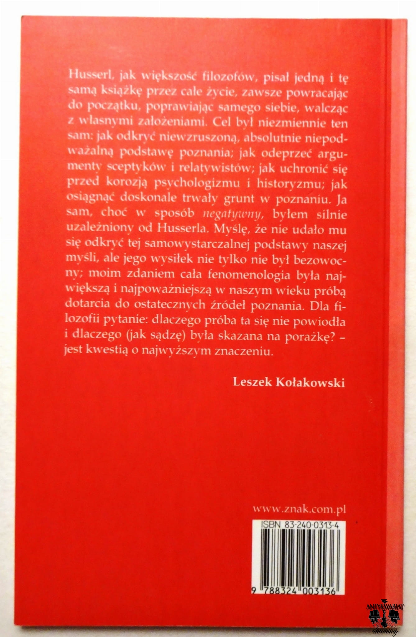 Husserl, twórca (nie samodzielny, a raczej jeden z twórców) fenomenologii poświęcił znaczną część pracy swojego mózgu na prowadzenie poszukiwań ostatecznego źródła poznania. Celem jego dociekań była upragniona wyspa poznawczej pewności, o gruncie stabilnym i odpornym na psychologizmy i historycyzmy. Czy udało się Husserlowi dotrzeć do fenomenologicznego raju? Nie. Dlaczego? To właśnie wyjaśnia Leszek Kołakowski w prezentowanym dziele: „Husserl i poszukiwanie pewności”.