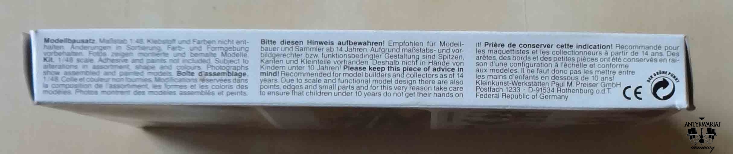 Precyzyjny model (makieta silnika z detalami) z elementami fototrawionymi w zestawie, ale kalkomania bez swastyki. Orwellowskie groby pamięci w praktyce. Nie jest ważne, jaka była prawda, ważne jest, by obecna linia polityczna propagandy niemieckiej obejmowała również cenzurę wyglądu... zabawek wyprodukowanych w Hong Kongu. Ciekawe, czy model jest równie wierny oryginałowi z przeszłości, jak jego kamuflaż? Już nie można się w tym połapać: jeśli samolot ze swastyką jest "nazistowski", a bez swastyki "niemiecki", to na jakich samolotach latali "Naziści", a na jakich "Niemcy"? Aha, ci na swoich i ci na swoich... czyli w pudełku samolot niemiecki. Ale w czasie wojny latały tylko "nazistowskie", bo ze swastyką. Czyli gdzie latał samolot, którego model można zrobić z zestawu? Jest koncepcja, że to był niemiecki samolot (bo bez swastyki) i on walczył z samolotami "nazistowskimi", tymi ze swastyką. A na pudełku jest pokazany niemiecki samolot, który ściga samolot "nazistowski" (nie pokazany na pudełku), bo chce pomścić strącony bombowiec amerykański (pokazany na pudełku), bo niemieccy lotnicy wyzwalali Berlin razem z amerykańskimi spod okupacji "nazistowskiej". No, wreszcie wszystko jasne. Wagony z napisem "Nur Fur Deutsche" też były po to, by dobrzy Niemcy mieli gdzie chronić słabsze rasy przed "Nazistami"... W ogóle, gdyby nie Niemcy, to nie wiadomo jak by się potoczyła wojna z "Nazistami". Chwała Bogu, że Niemcy były, są i będą przeciwko "Nazistom". Czego dowodzą pudełka zabawek.
