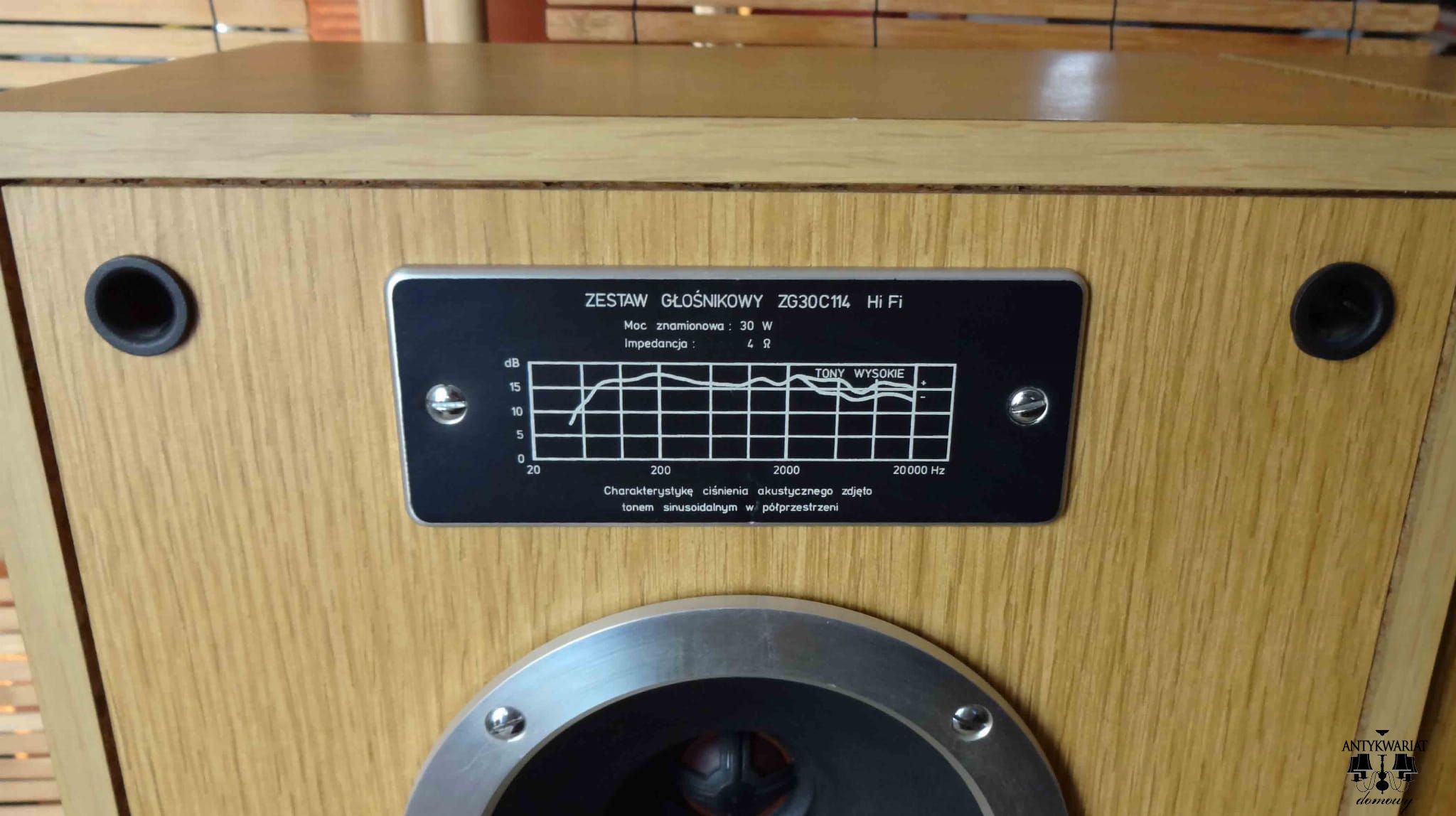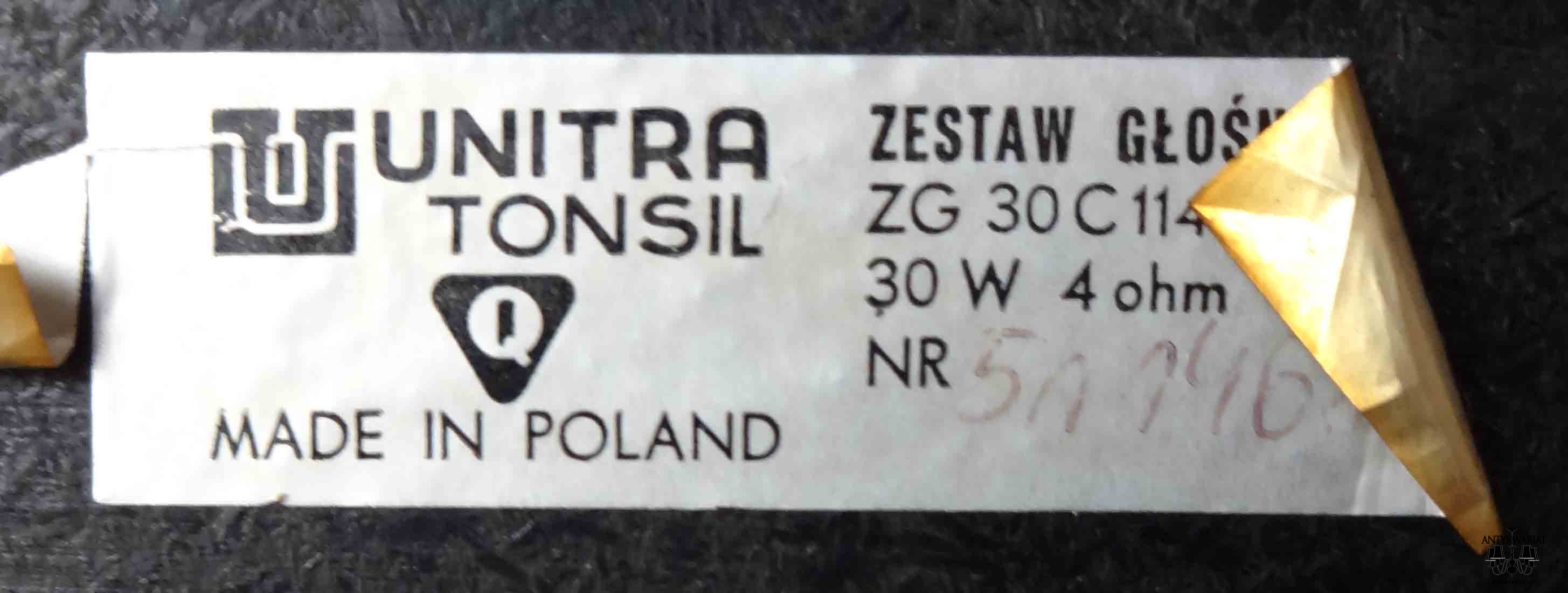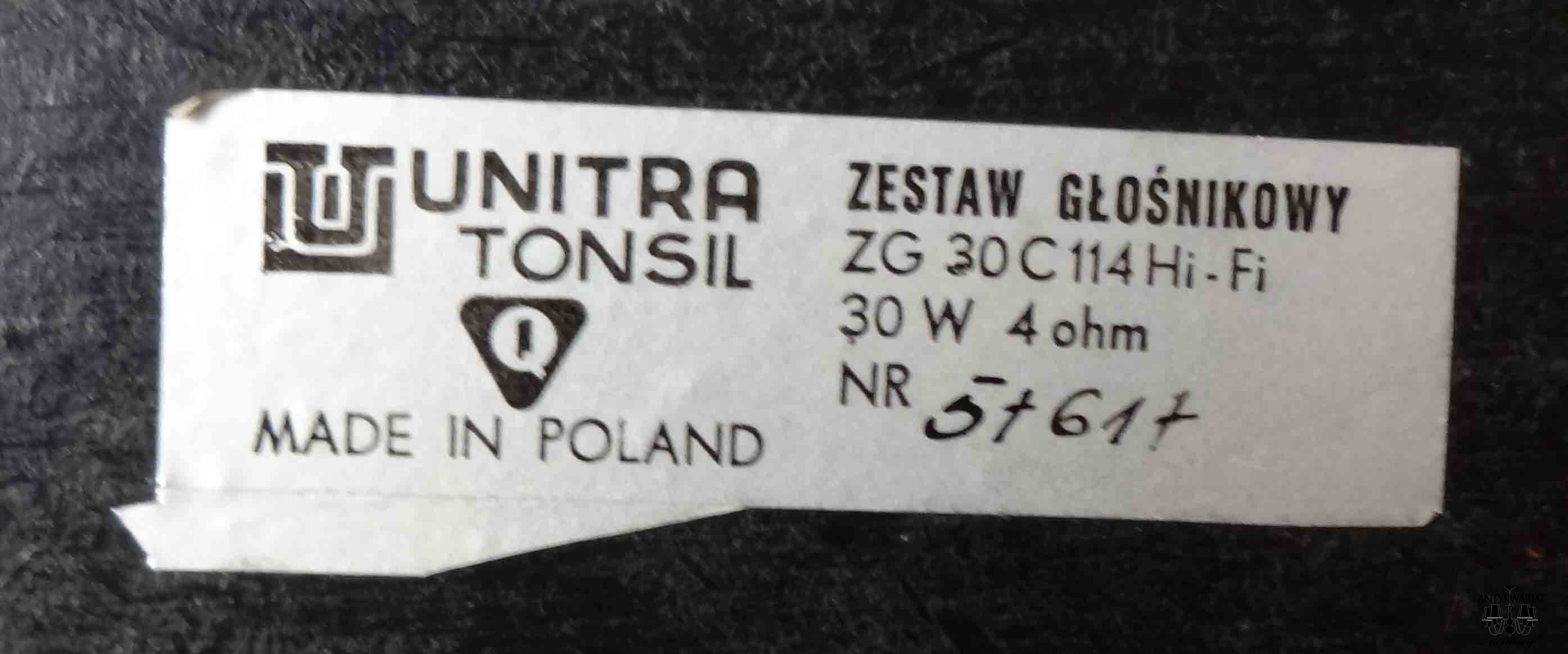 Zestaw głośnikowy UNITRA TONSIL ZG 30 C 114 Hi-Fi, 30 W 4 ohm - to wszystko można przeczytać an naklejce producenta. Wydrukowano również na niej znak jakości "Q", jakim w PRL-u oznaczano wyroby mające najwyższą jakość, jakość "eksportową". Oczywiście przeciwnicy UNITRY będą pokpiwać z tego wyrobu, bo przeciwnicy UNITRY mają za nic starania i wysiłek ówczesnych miłośników Hi-Fi. Natomiast wszyscy, którym bliskie są dźwięki wytwarzane przez PRL-owski sprzęt najwyższej jakości na pewno docenią brzmienie tych kolumn, tym bardziej, że są one w doskonałym stanie. Kilka lat temu przeszły profesjonalną, firmową konserwację i dalej doskonale spełniają swoją rolę. Grają codziennie - podłączone do odpowiedniego sprzętu cieszą ucho wszystkimi swoimi zaletami.